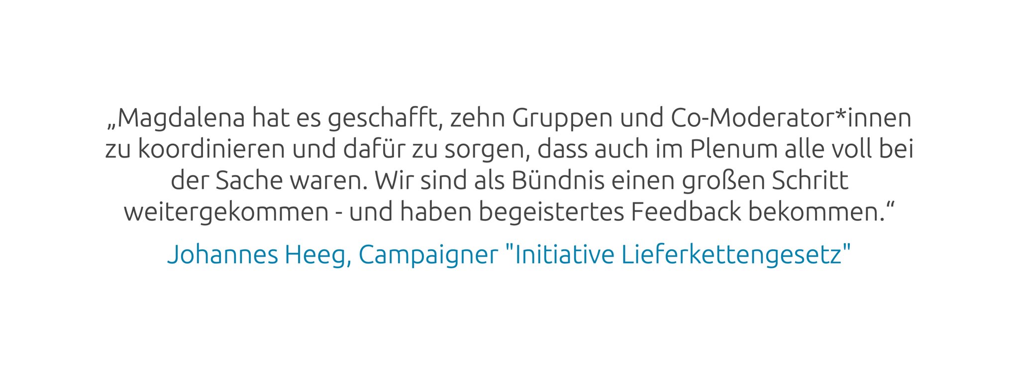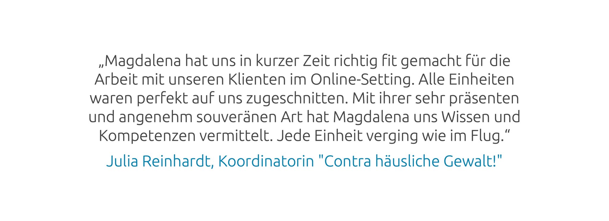 Magdalena ist Teil des Beratungs-Pools für Akteur*innen des Bundesprogramms "Demokratie Leben!" mit den Schwerpunkten Diversity, Online-Zusammenarbeit und Teamentwicklung. Auch ehrenamtlich ist sie gern für gemeinnützige Organisationen im Einsatz. So leitete sie die Berliner Aktionsgruppe „Gegen Menschenrechtsverletzungen an Frauen“ von Amnesty International und begleitete eine Berliner Wohnbaugenossenschaft als Vorständin in der Transition zur Soziokratie. Seit dem Wintersemester 2021/22 ist Magdalena Lehrbeauftragte für Social Skills an der Business & Law School Berlin.